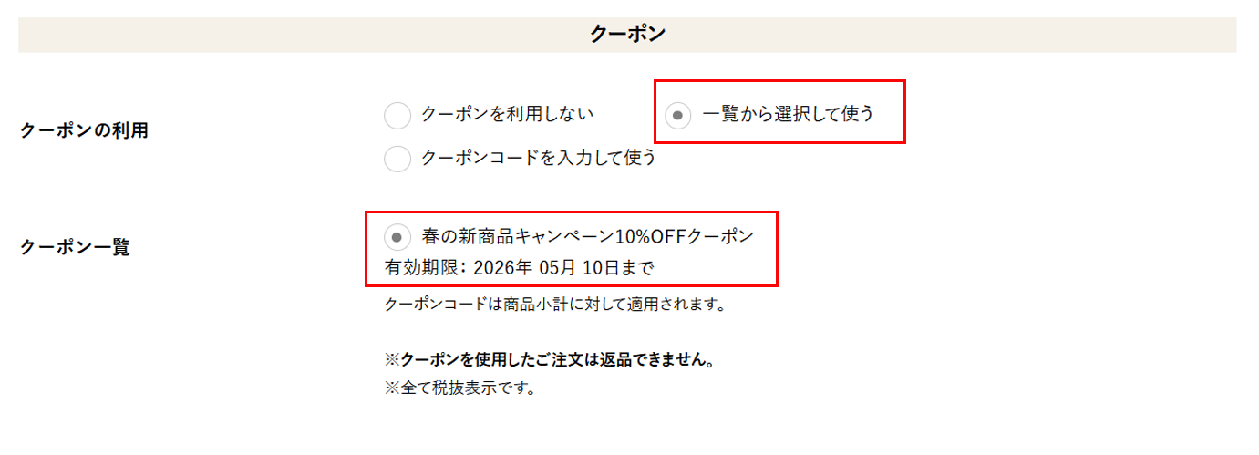 【クーポン】の項目にて【一覧から選択して使う】を選択し、【春の新商品キャンペーン10%OFFクーポン】を選択してください。