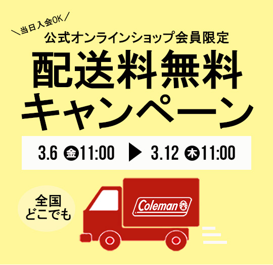 オンラインショップでは3月6日(金)11:00より、会員様限定【送料無料キャンペーン】を開催します。公式オンラインショップ会員、または新規会員登録をしていただいた方はお買い上げ金額にかかわらず送料無料でお届けします。